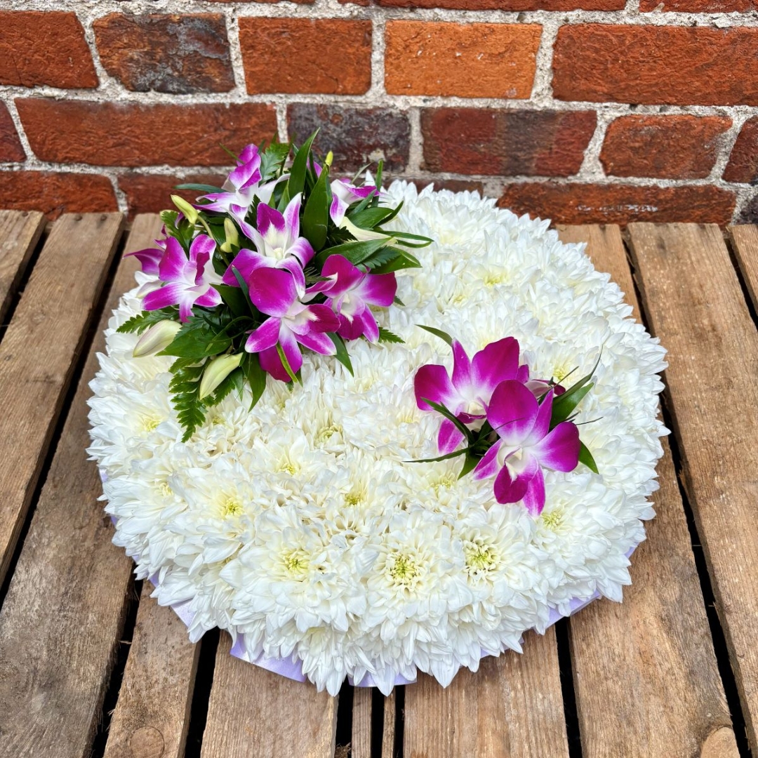 A classic posy design created using a mass of white double spray chrysanthemums and completed with a spray of flowers in your choice of colours with a ribbon edge to match.