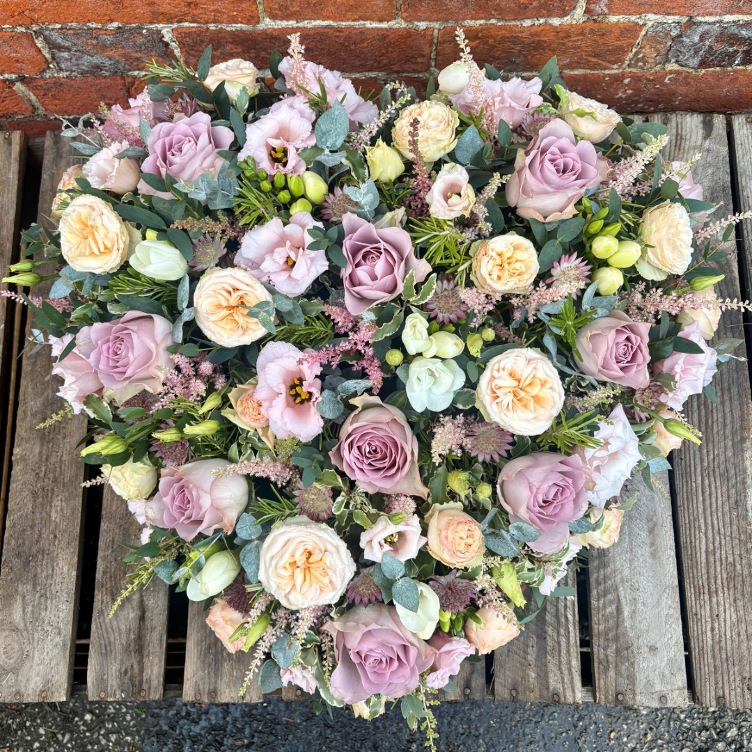 A beautiful selection of florals and foliages including roses come together to create a simple but meaningful design.