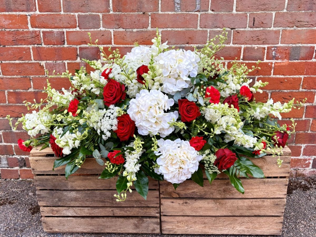 This elegant red and white casket spray is a timeless tribute. Featuring faux hydrangea, roses, and larkspur beautifully arranged with complementary foliage. A lasting floral tribute designed to honour a loved one with care and elegance.
