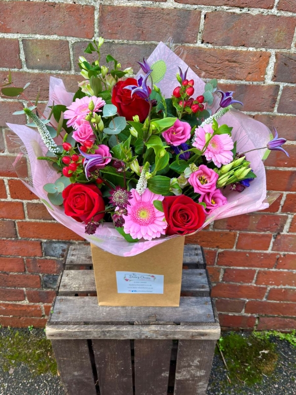 A stunning mixed hand tied in reds, pinks and purples featuring red roses, germini and seasonal foliage.