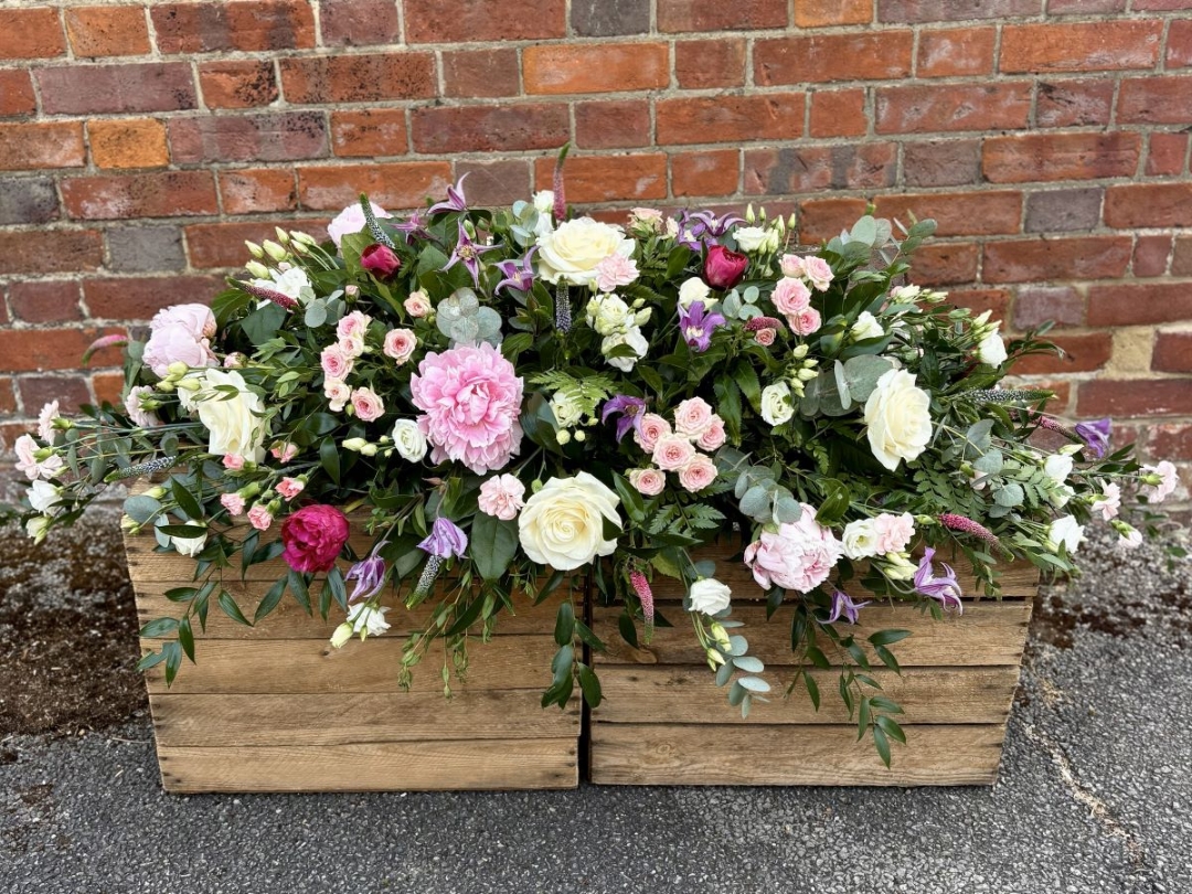 This country style casket spray in soft shades of pinks, whites, and purples offers a natural and heartfelt tribute. Featuring a charming mix of flowers with complementary foliage arranged by our expert team in Princes Risborough this relaxed, rustic style funeral tribute creates a warm and gentle farewell for funerals.